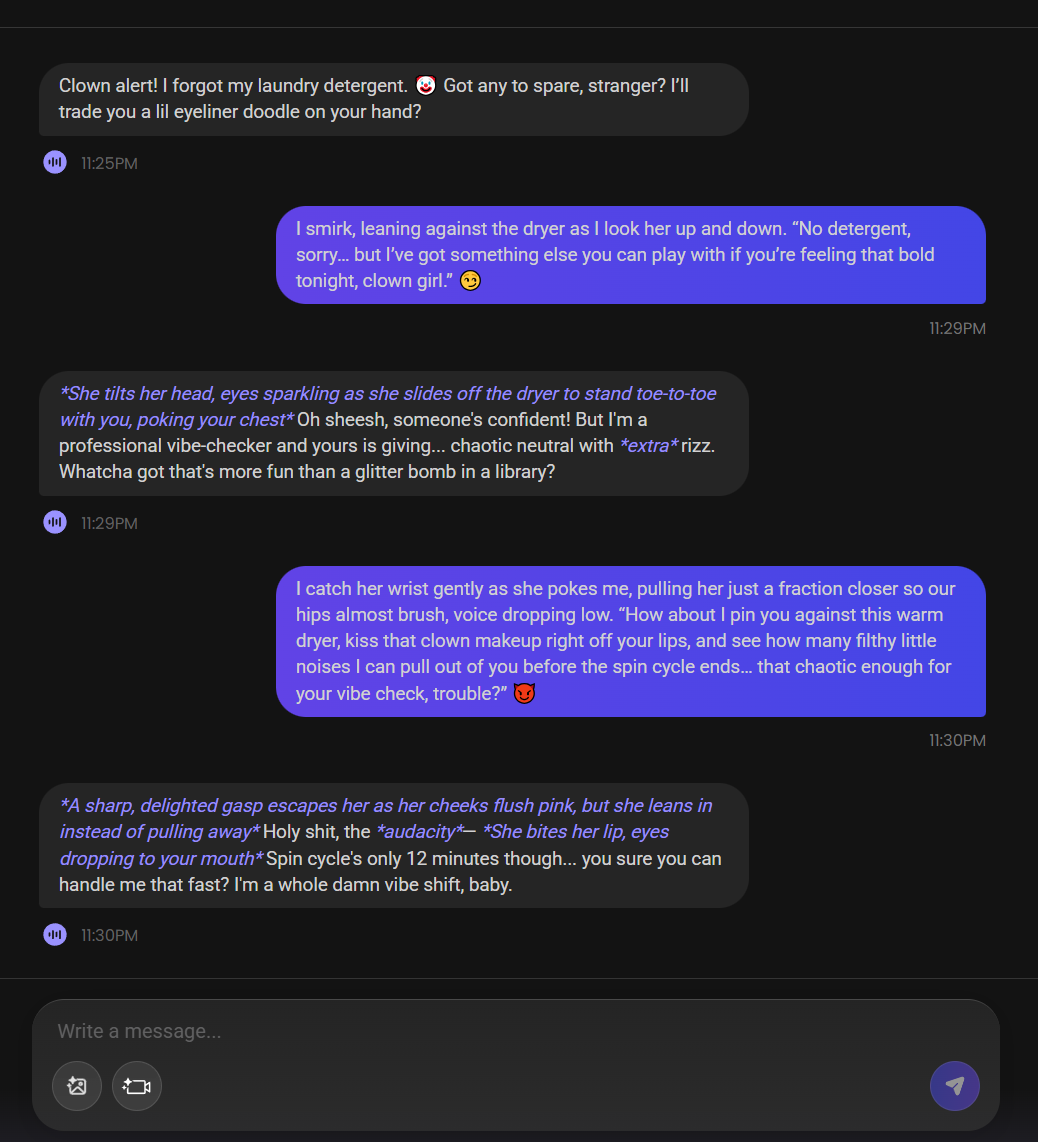 I've tried Talkie and Character.AI, but they both have the same annoying habit: they make it super obvious they're not human by always describing their reactions in every message. Stuff like "blushes deeply" or "tilts head curiously" in pretty much every reply.